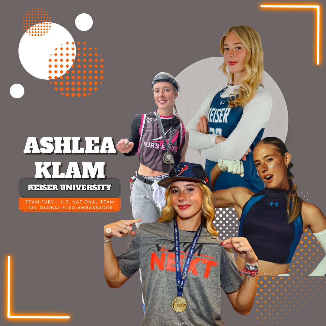 Ashlea is a standout flag football athlete for Keiser University, where she earned First Team All-Conference honors as a freshman after recording 27 touchdowns and 1,100+ yards—all while maintaining a 4.0 GPA. On the international stage, she helped lead Team USA to a gold medal at the 2024 IFAF World Championship. Ashlea is also the co-founder of Texas Fury, an all-girls flag football club committed to growing the game.